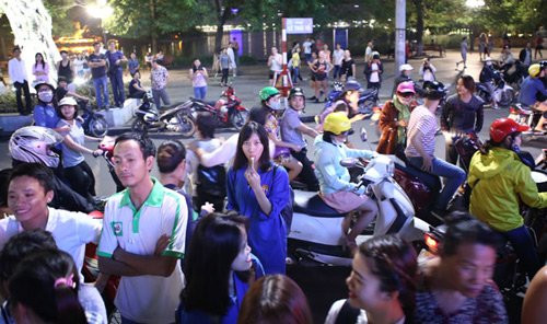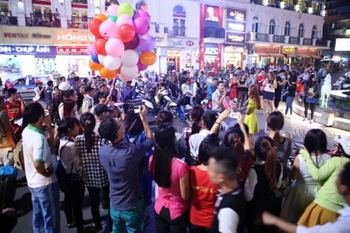 Tối 5/11, đường Đinh Tiên Hoàng (Hoàn Kiếm, Hà Nội), đoạn gần đài phun nước Hồ Gươm ùn tắc hơn nửa giờ đồng hồ vì màn cầu hôn của một chàng trai với tân hoa khôi sinh viên Hà Nội.