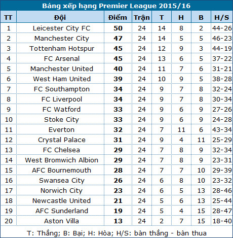 Leicester City đang dẫn đầu bảng xếp hạng sau 24 vòng đấu