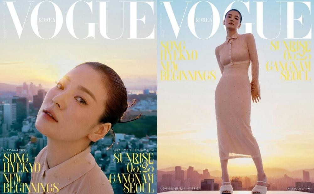 Xuất hiện trên bìa VOGUE Hàn với 2 phiên bản, Song Hye Kyo mang đến một diện mạo hoàn toàn khác với tóc búi chặt phía sau đầu, không để mái, khoe trọn đường nét thanh tú, sắc nét của khuôn mặt.