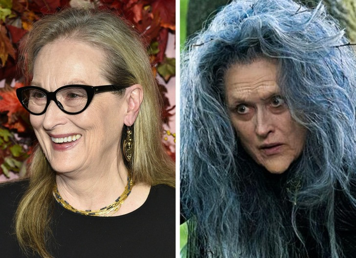 Meryl Streep hóa thành phù thủy độc ác nhờ lớp trang điểm ấn tượng. Diễn viên đội tóc giả màu xám, xơ xác khiến khán giả khiếp sợ, không thể nhận ra.