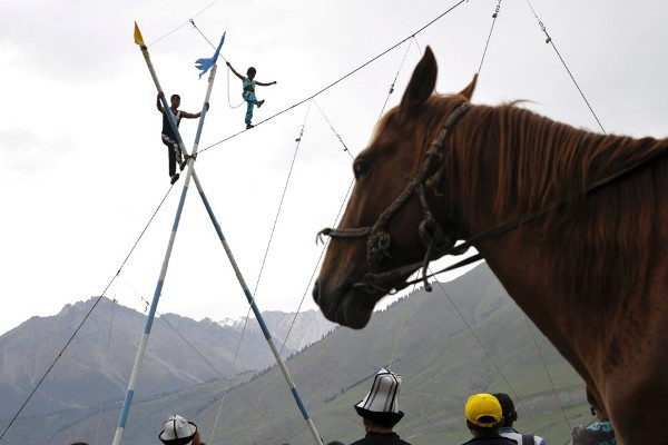Đu dây trên không có lẽ là môn thể thao mạo hiểm nhất trong đại hội thể thao này. Cuộc sống nay đây mai đó đòi hỏi con người phải luôn linh hoạt đối phó với mọi khó khăn thử thách. Hình ảnh một bé trai tham dự thi đấu đu dây trên không thể hiện sự kiên cường, khéo léo và một tinh thần thép của những em bé du mục. Ảnh: Washington Post