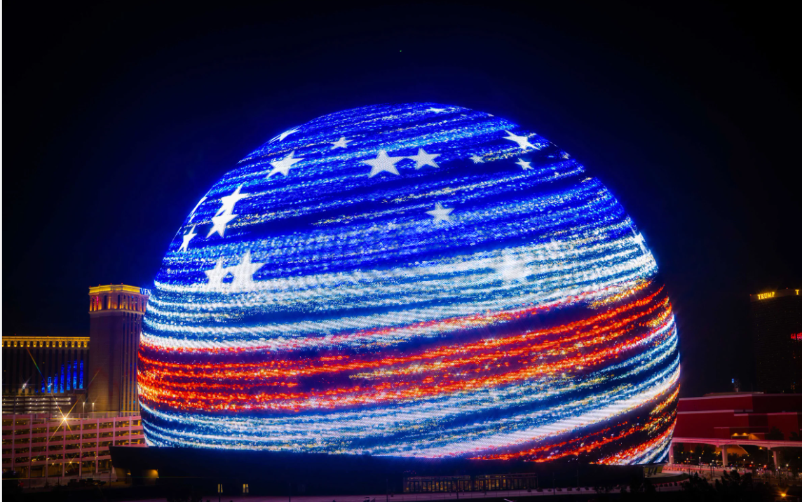 Những thước phim ghi lại màn trình diễn ánh sáng tuyệt đẹp của quả cầu siêu to khổng lồ. (Nguồn: @vegaslately)