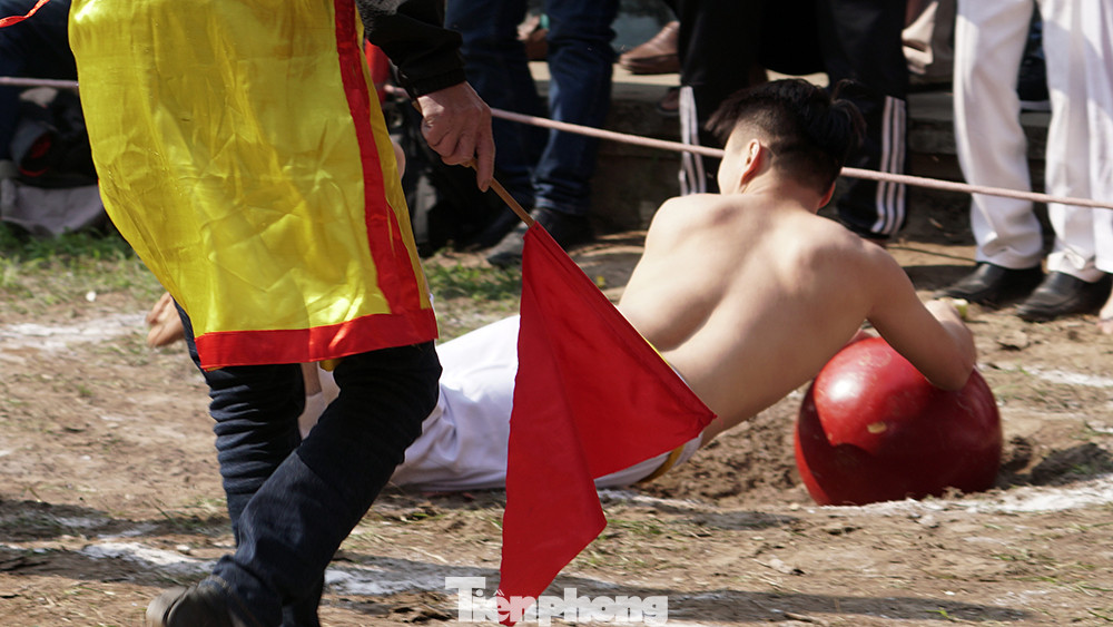 Sự bất lực của đội bạn khi một thành viên đội đỏ ôm quả cầu nặng gần 20kg băng băng về hố cầu của đội mình để thả vào đó.