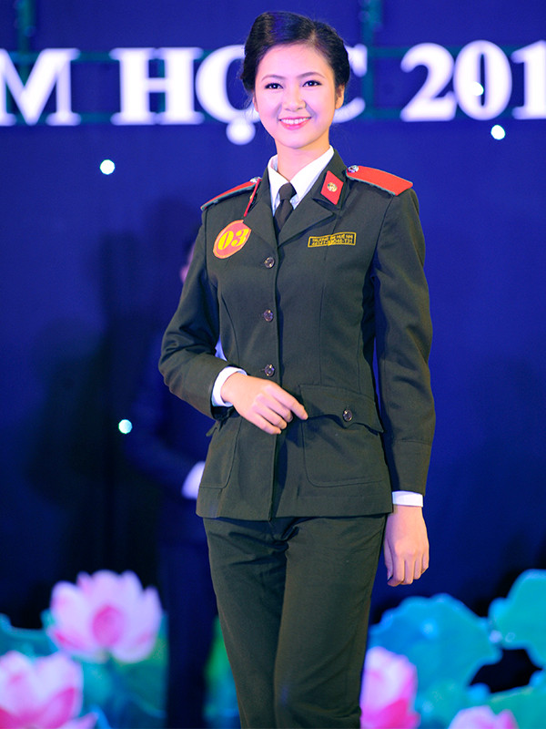 Trương Thị Huệ Nhi (SN 1996) là sinh viên lớp B3D46 - CK1. Trong phần thi trang phục bắt buộc, Huệ Nhi cứng cỏi và không kém phần duyên dáng với bộ áo ngành an ninh màu cỏ úa