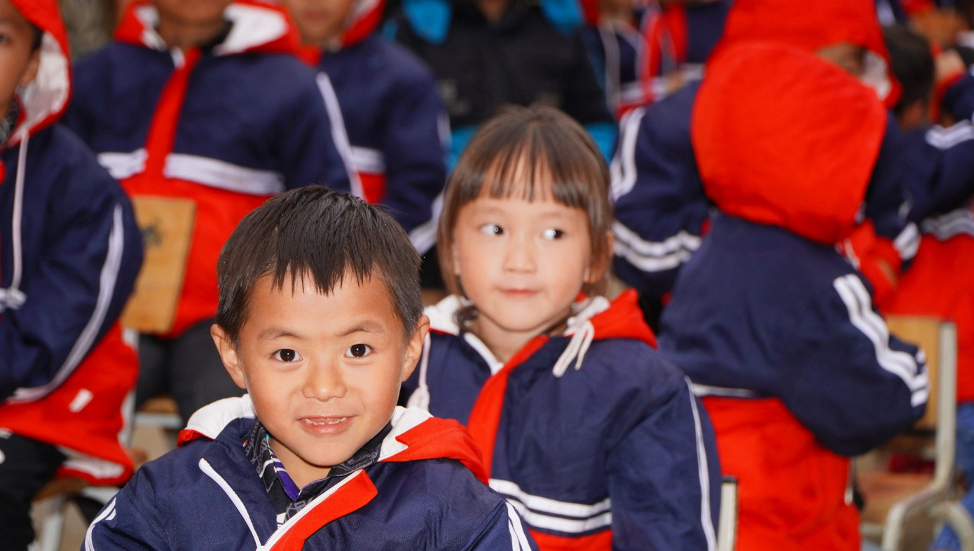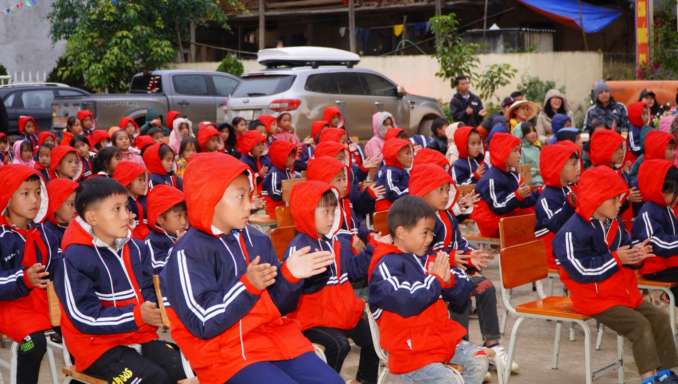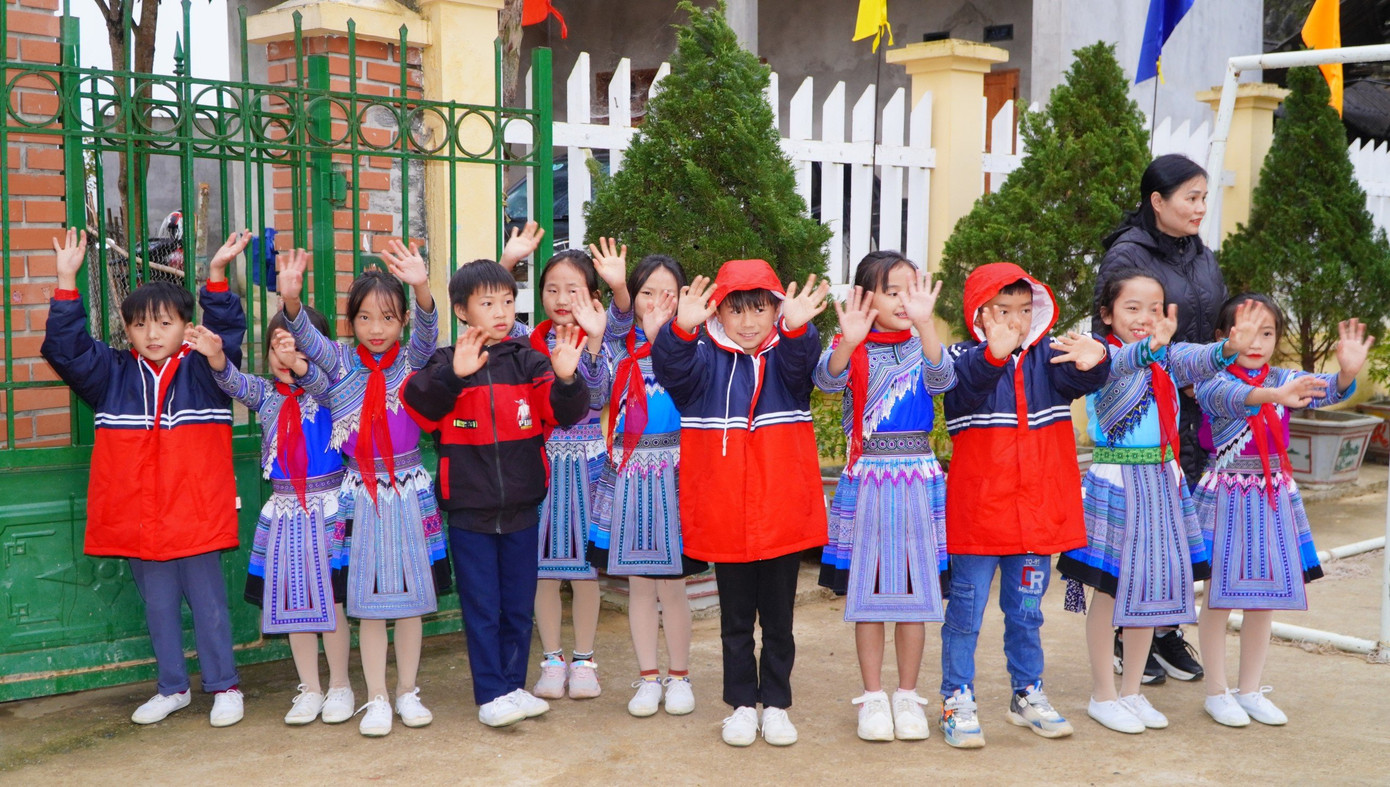 | Niềm vui của các em học sinh Si Ma Cai trong những chiếc áo ấm mới. |