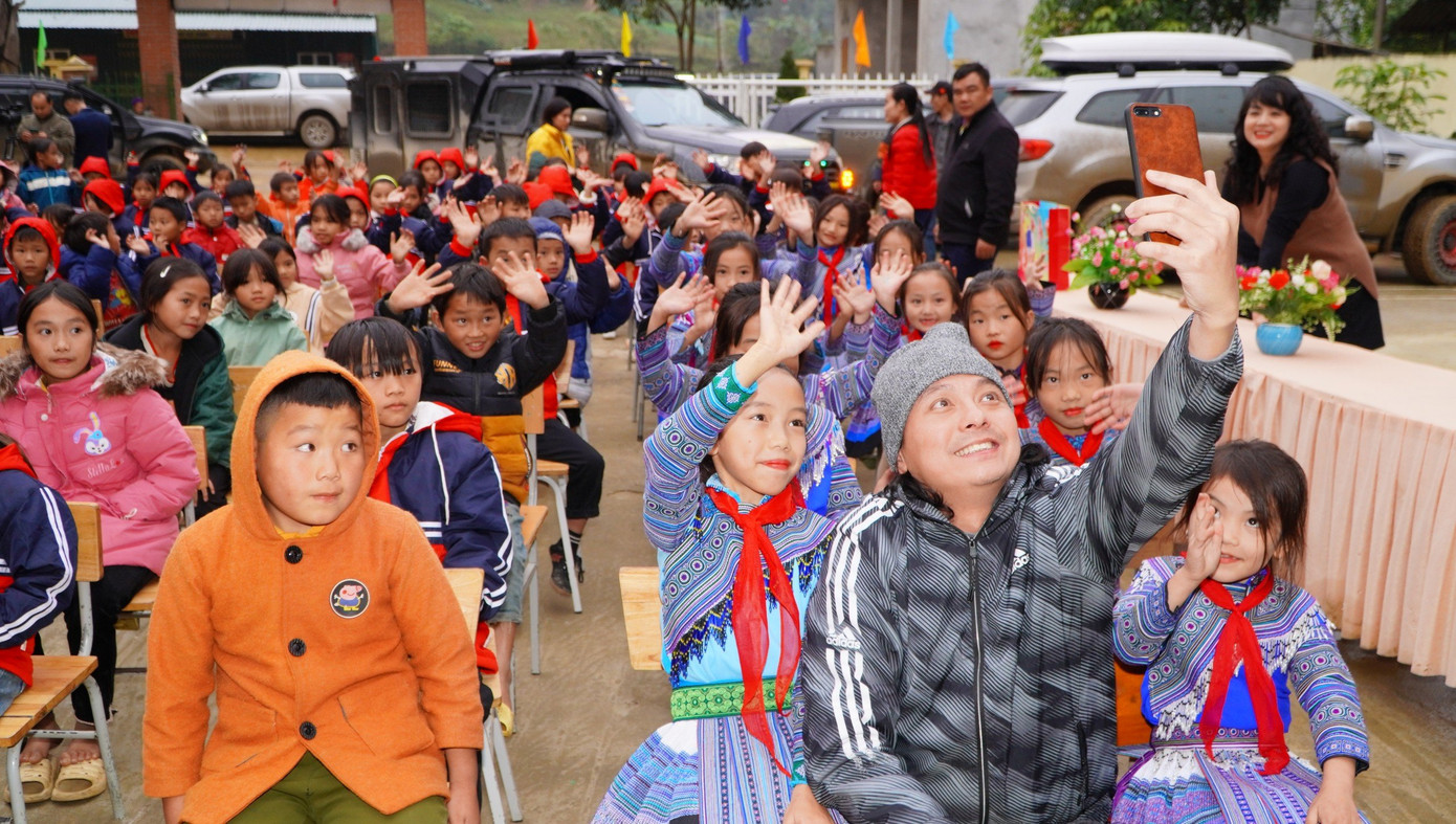| Anh Nguyễn Đức Tiến - Phó Bí thư Thường trực Thành Đoàn, Chủ tịch Hội LHTN TP Hà Nội tặng dép mới cho học sinh Si Ma Cai. |