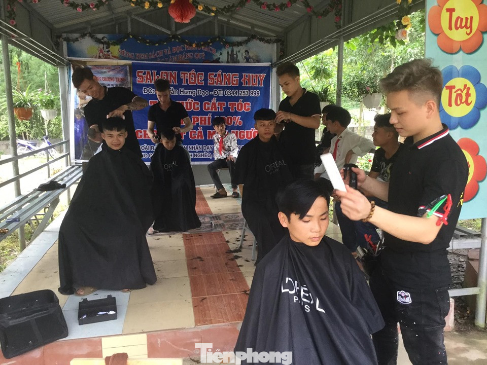 Các em học sinh còn được các thợ trẻ Salon tóc Sáng Huy (TP Lạng Sơn) cắt tóc miễn phí nên rất hồ hởi, phấn khởi .Ảnh: Duy Chiến
