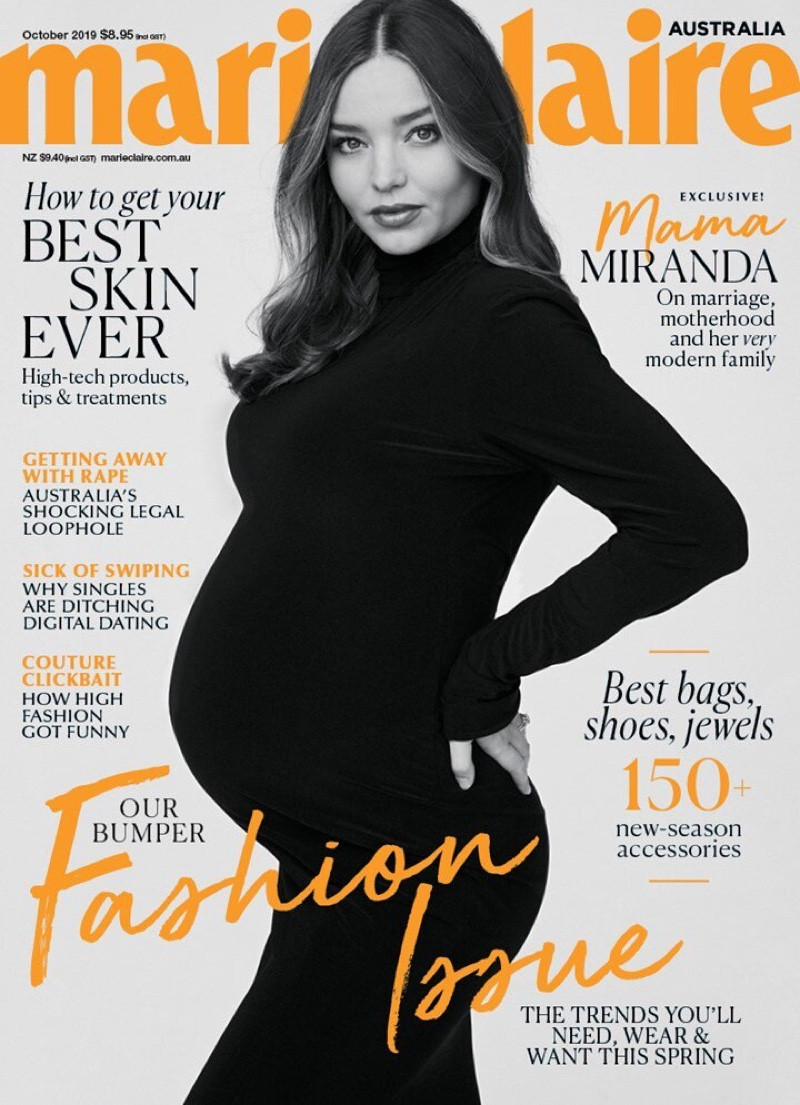 Vẫn với ánh mắt xanh như ngọc và gương mặt bầu bĩnh xinh như búp bê, Miranda Kerr khoe bụng bầu lớn trên tạp chí Marie Claire số tháng 10/2019.