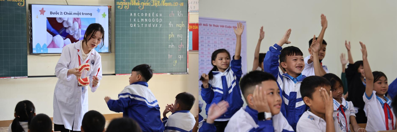 Không chỉ với người lớn, các em học sinh cũng vô cùng hào hứng khi được các giảng viên đến từ Bộ môn Nha khoa Cộng đồng thuộc Viện Răng -Hàm Mặt của Trường Đại học Y Hà Nội hướng dẫn về cách chăm sóc răng miệng đúng cách.