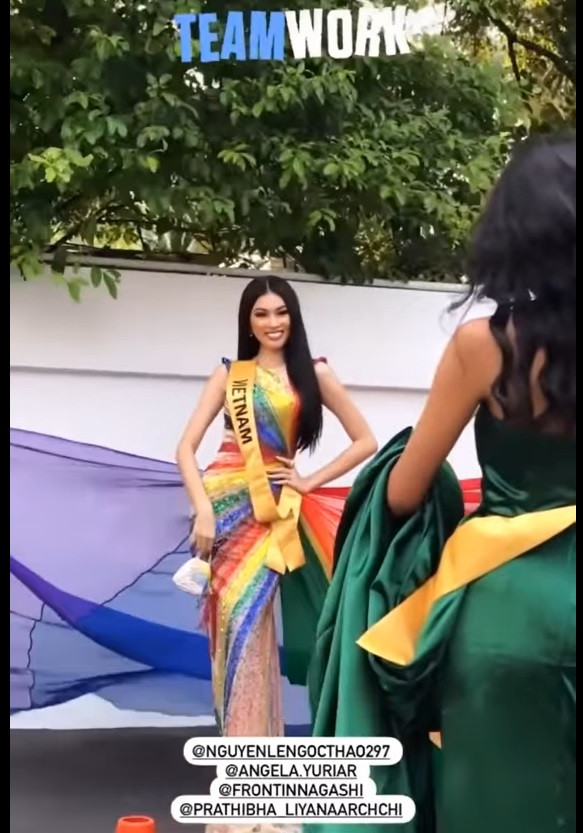 Trong hoạt động chính thức đầu tiên của cuộc thi Miss Grand International 2021 đó là chụp hình profile, Á hậu Ngọc Thảo nổi bật khi diện bộ váy lục sắc lộng lẫy.