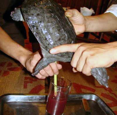 Còn nhớ cách không lâu, tại nhà hàng có khách yêu cầu làm thịt nguyên một con ba ba cho họ, ngay lập tức quản lý nhà hàng gọi nhân viên ra cân ba ba lên đàng hoàng để tính tiền, sau đó cắt tiết ba ba pha vào rượu cho khách uống luôn tại bàn, còn ba ba được đem vào trong làm thịt và chế biến thành các món om chuối đậu, rang muối... Tuy nhiên, vị quản lý nhà hàng này đã lệnh cho nhà bếp chỉ được chế biến 4/5, còn 1/5 con ba ba thì giữ lại.