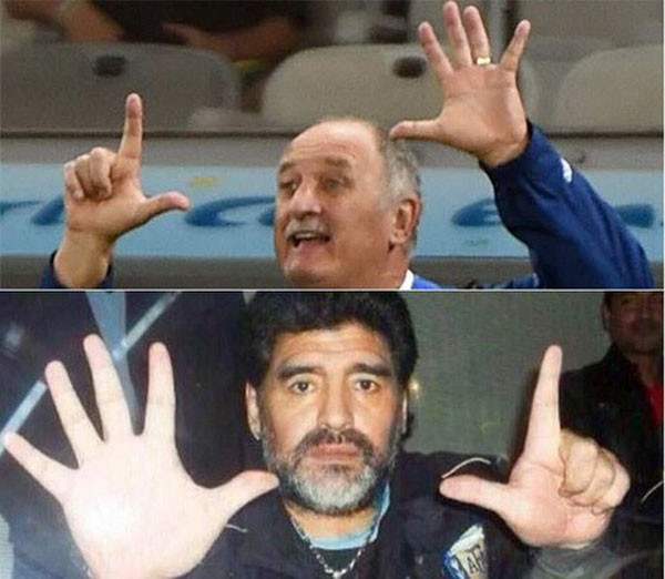 Trong bức ảnh này, Diego Maradona ăn mừng bằng cách giơ 7 ngón tay, ám chỉ số bàn thua mà Brazil phải nhận ở trận đấu với Đức trên sân vận động Estadio Mineirao.