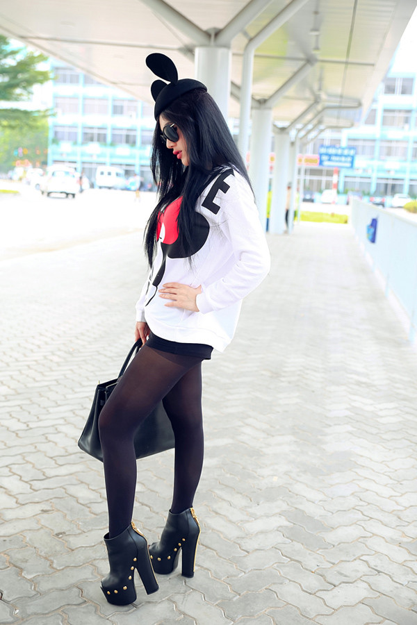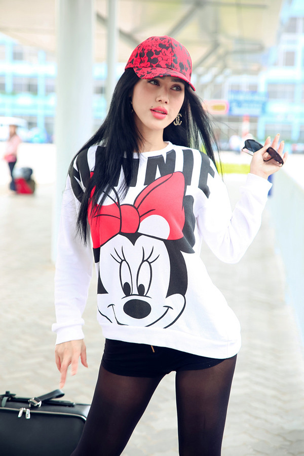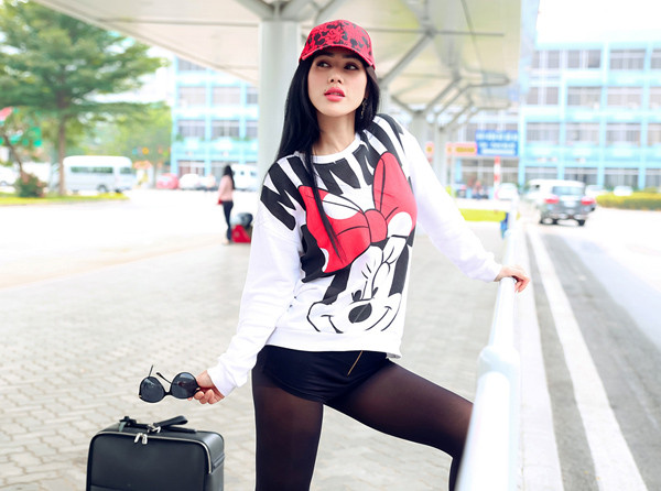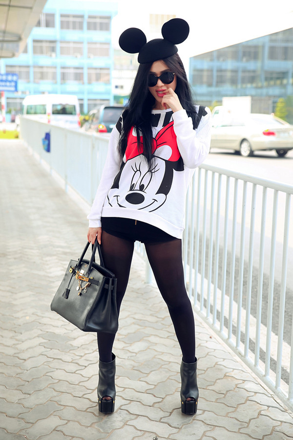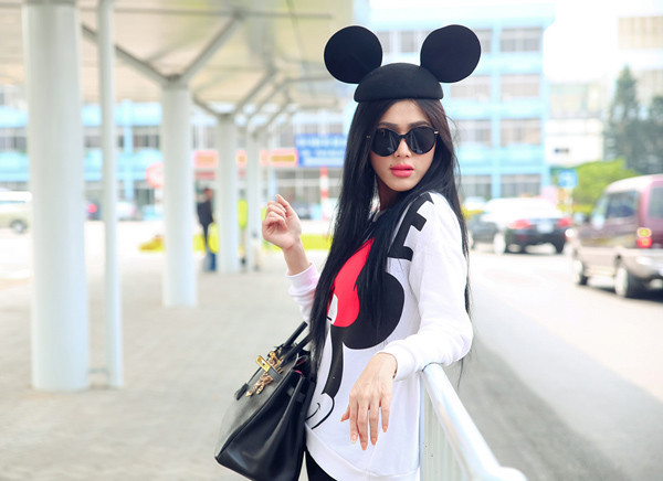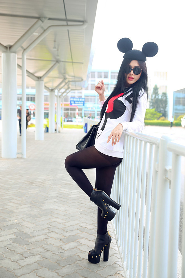 Khác với hình ảnh của các sao ngoại, Maria Đinh Phương Ánh chọn cách kết hợp khá hợp lí giữa chiếc nón có hình tai chuột cùng áo thun rộng và quần tất.