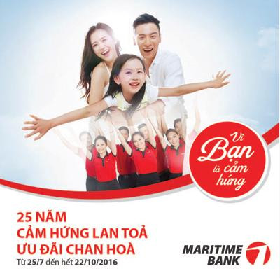 Mừng sinh nhật 25 năm và thay lời tri ân tới khách hàng, từ ngày 25/7 – 22/10/2016, Maritime Bank triển khai chương trình “Cảm hứng lan tỏa, Ưu đãi chan hòa” với 60.000 giải thưởng dành tặng ngay cho khách hàng giao dịch tại quầy, nhiều cơ hội nhận hoàn tiền tới 100% mỗi ngày cùng những giải thưởng may mắn hàng tháng và cuối chương trình.