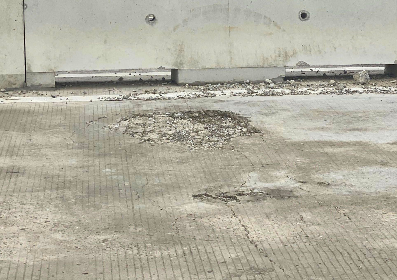 | Doanh nghiệp dự án cho biết, vị trí bị bong tróc là điểm xây dựng đảo chia làn thu phí nhưng chưa được thi công. Để phục vụ thông xe, nhà thầu đã đổ tạm bê tông mác thấp. |
