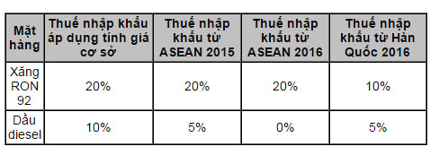 Với sản phẩm nhập từ ASEAN, thuế áp dụng trong năm 2015 với dầu diesel và madút là 5% và từ 1/1/2016 là 0% (thuế với xăng vẫn là 20%, tương tự các thị trường khác). Từ đầu năm nay, thêm thuế nhập dầu diesel từ Hàn Quốc về Việt Nam cũng giảm về 5%, thuế xăng về 10% (thấp hơn thị trường khác 10%).