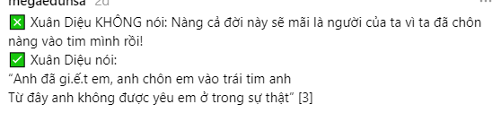"Cơ mà thỉnh thoảng cứ có cái kiểu ngữ pháp văn phong ngôn tình nghe sao chép với tối nghĩa mà nhiều bạn nâng cao quan điểm tưởng nó là hay. Kiểu cũng bị ảnh hưởng nhưng dạo gần đây mới thực sự nhận ra vẻ đẹp của tiếng Việt khi đọc lại mấy tác phẩm xưa. Từ vựng dùng giản dị đến bất ngờ mà ý nghĩa bao la vô cùng tận, không hề cần đến Hán Việt hay kiểu ngữ pháp hơi đảo kiểu Trung Quốc."