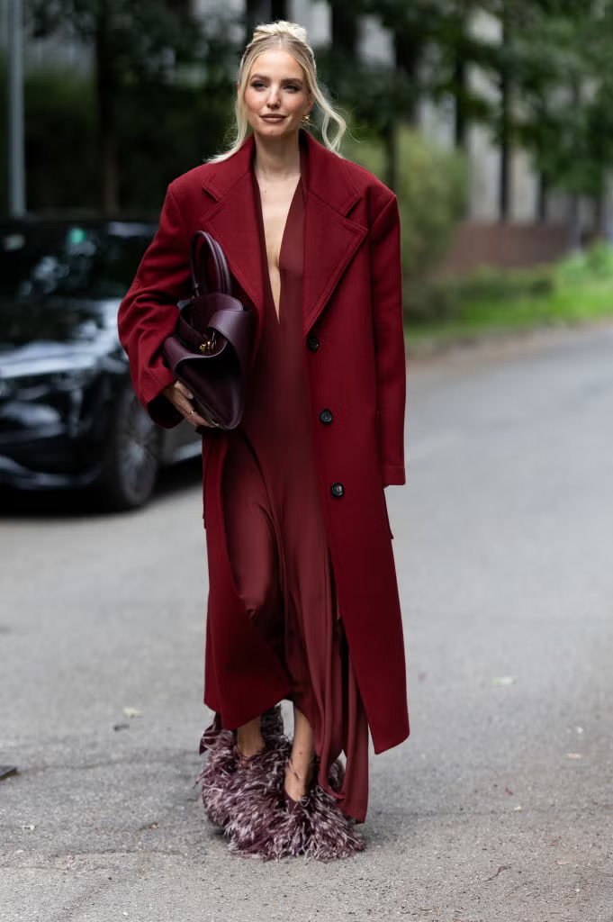 Màu trung tính mới của mùa Thu Đông là đỏ rượu vang, thường được nhắc đến với những tên gọi như burgundy, bordeaux, maroon, oxblood, port, merlot, pinot và red wine. Ít nổi bật hơn so với những sắc đỏ tươi, nhưng lại hoàn hảo để diện trong không khí lạnh lẽo, nhiều sương và khắp nơi đều giăng đèn lấp lánh.