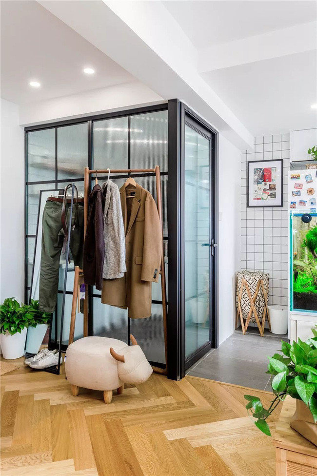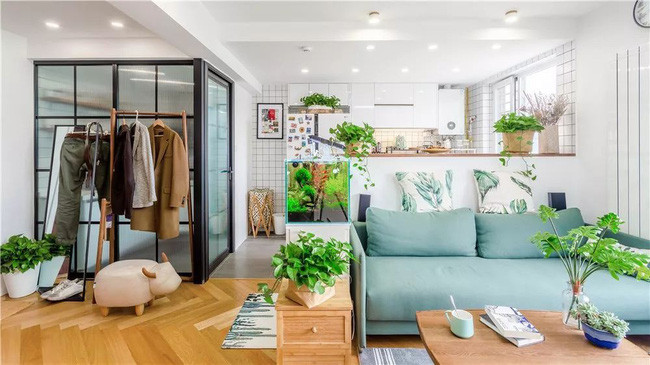 Việc lựa chọn sàn gỗ có tone màu sáng cùng họa tiết xương cá tạo cảm giác rộng rãi cho không gian.