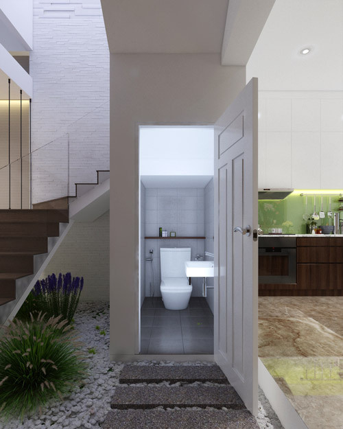 Phòng vệ sinh phân chia ranh giới giữa phòng khách và bếp.