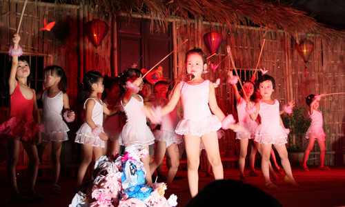 Đây là một trong nhiều tiết mục của các em nhỏ trong chương trình "Vui tết Trung thu" do chùa Tạo Phúc Thọ (xã Phù Lỗ, huyện Sóc Sơn, TP. Hà Nội) và Đoàn TN Học viện Cảnh sát nhân dân phối hợp tổ chức (tối 15/9).