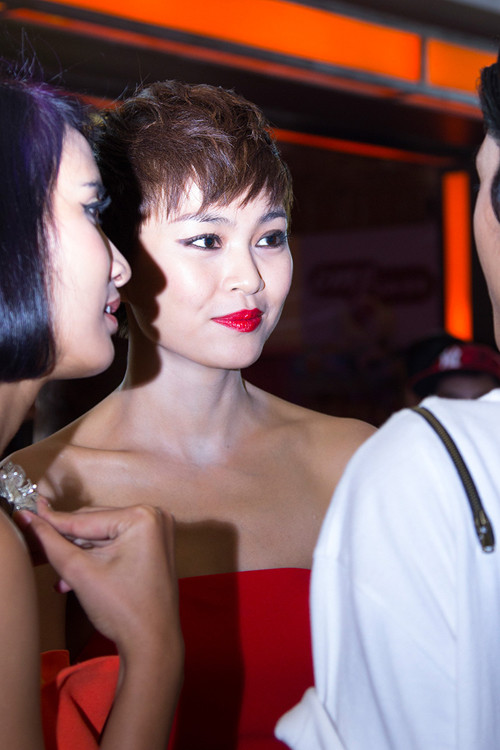 Với ngoại hình nổi bật, sự tự tin, cùng phong cách thời trang bắt mắt Quán quân Mâu Thanh Thủy và Top 6 đã nhận được sự quan tâm của đông đảo báo giới. Cô khoe bờ vai trần thon thả và vòng một quyến rũ trong bộ váy quây đỏ rực.