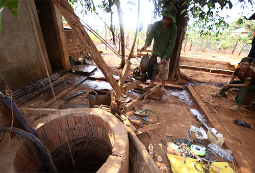 Ăn vội chén cơm nguội buổi sáng, ông Nguyễn Văn Cầu (45 tuổi, trú xã Ia Drăng, Chư Prông, Gia Lai) chạy chiếc xe máy cà tàng vào trong làng. Đến trước miệng giếng đã được đào sâu gần 30 m, việc đầu tiên của ông Cầu là bật chiếc máy khò chõ thẳng xuống giếng. "Buổi sớm nhiều khí độc lắm, nếu xuống đào ngay là bỏ mạng như chơi", ông lý giải.