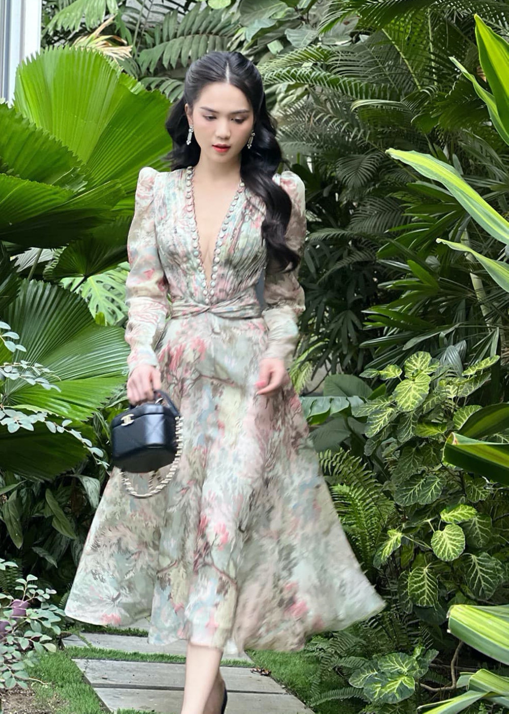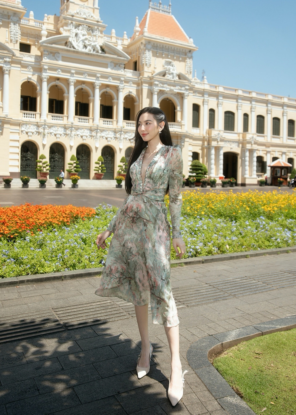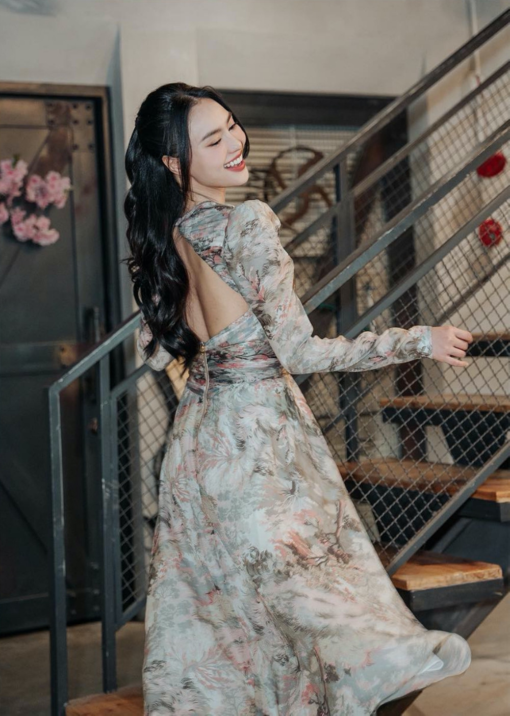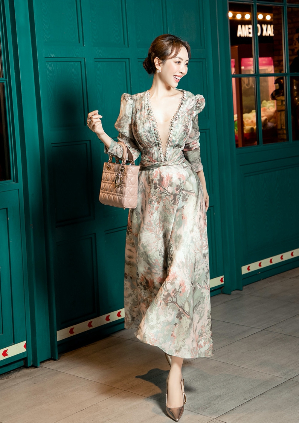 Mẫu váy có nhiều phiên bản màu sắc, hoạ tiết khác nhau, nhưng màu sắc được mỹ nhân Việt lựa chọn nhiều nhất chính là gam màu đẹp như một bức tranh. Họa tiết được in sắc nét trên nền chất liệu tơ gân mềm mại, bay bổng, mang đến vẻ đẹp cổ điển, mong manh và nhẹ nhàng, rất hợp với mùa Hè.