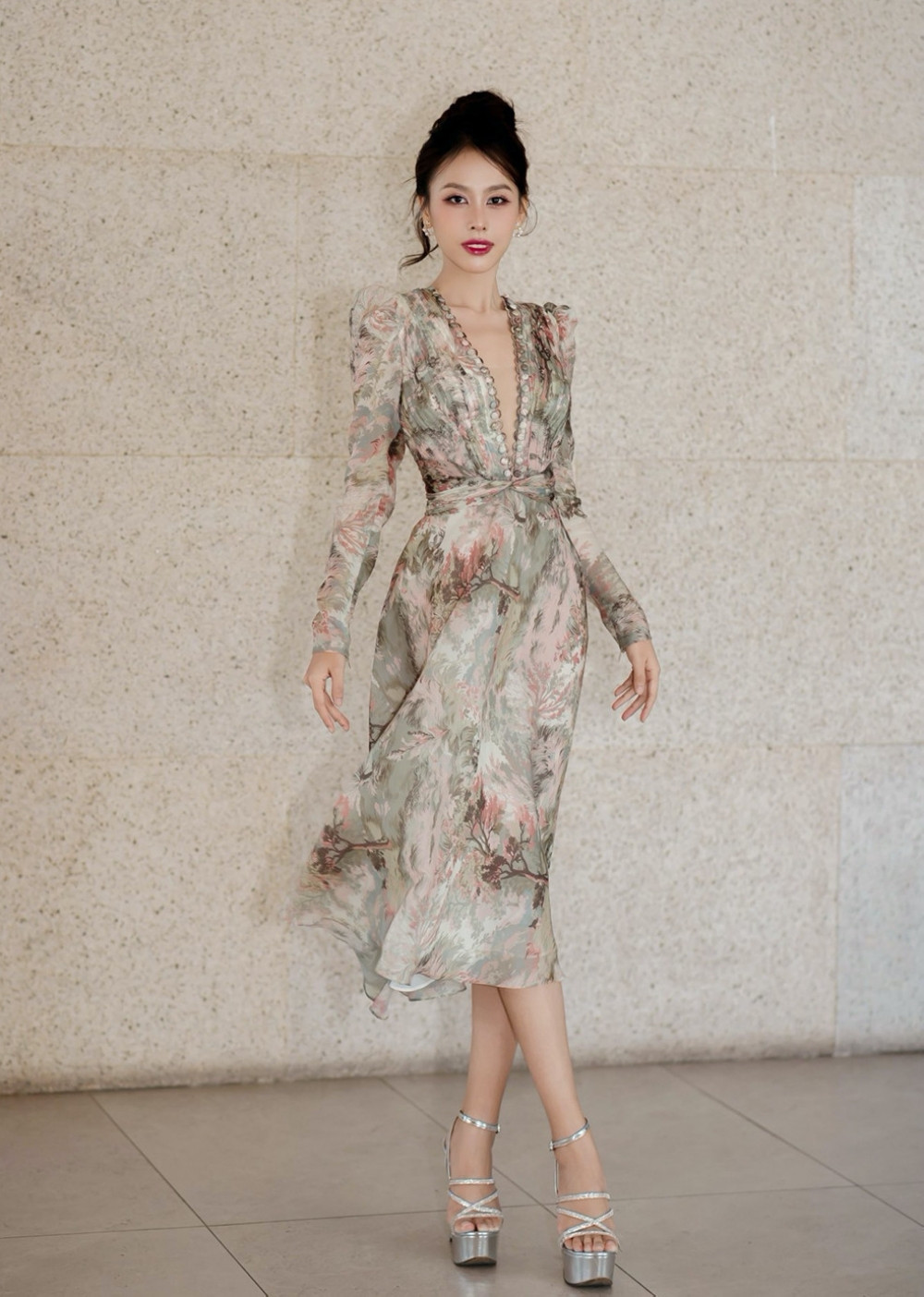 Hoa hậu Ngọc Châu chọn kiểu tóc buộc cao, nàng hậu đi dép cao gót điệu đà, rất hợp với mẫu váy.