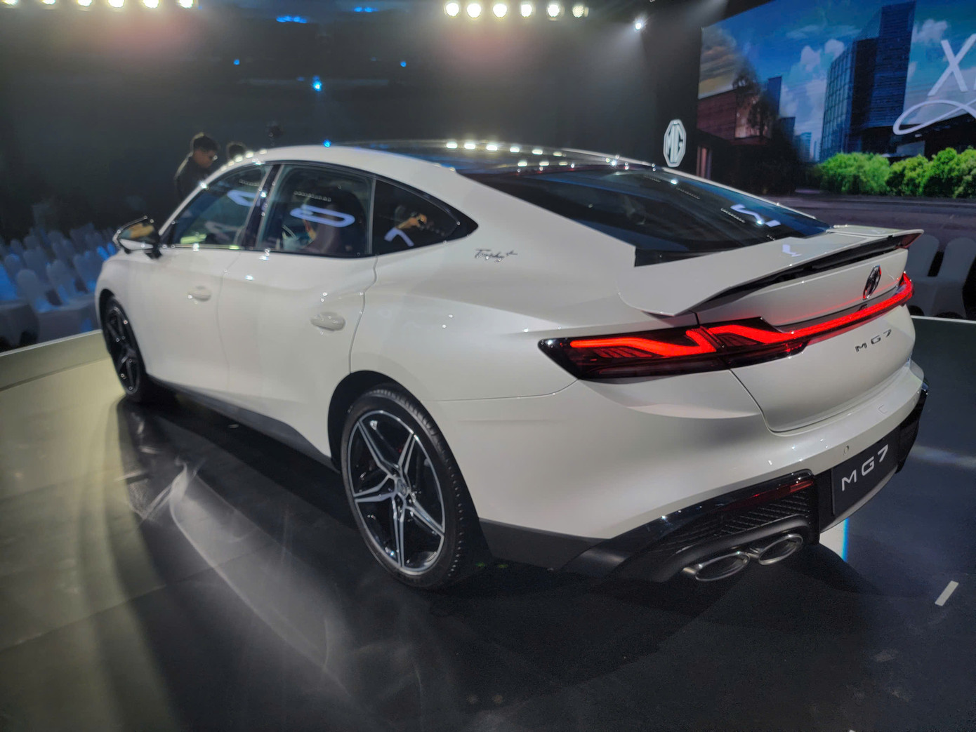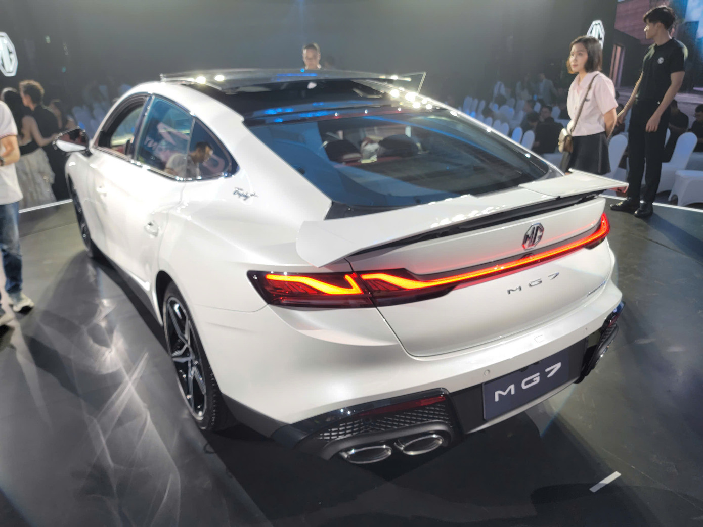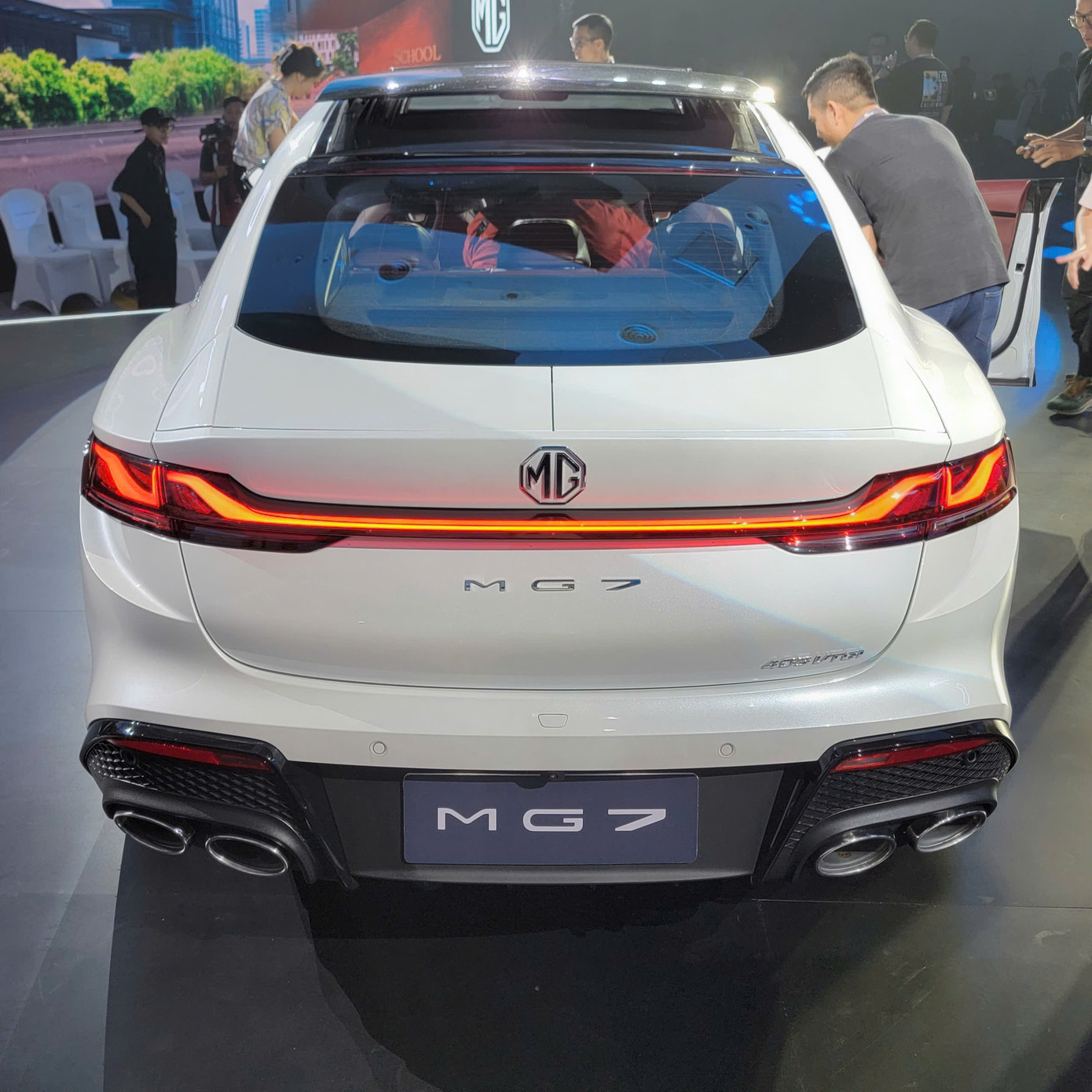 Phía sau xe là dải đèn hậu LED nối liền. Hai góc dưới của cản sau là cặp ống xả kép hầm hố. Đáng chú ý, MG7 được trang bị một cánh gió bán tự động sẽ mở ra khi đạt vận tốc hơn 100km/h và đóng lại khi xe chạy dưới 70km/h. Ngoài ra, người lái cũng có thể tùy ý nâng hạ bộ phận này thông qua nút chức năng trong khoang cabin.