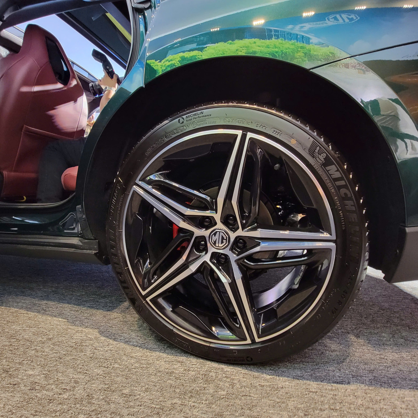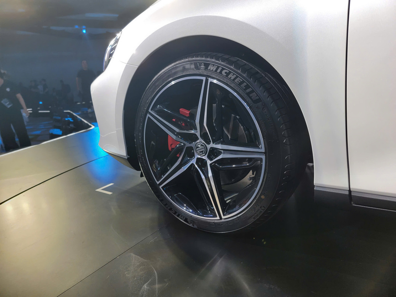 Nhìn từ bên hông, thân xe MG7 được dập các đường gân nổi tạo hình cơ bắp. Xe sử dụng bộ vành hợp kim 5 chấu kích thước 19 inch với hai tông màu, đi kèm kẹp phanh sơn đỏ thêm phần thể thao.
