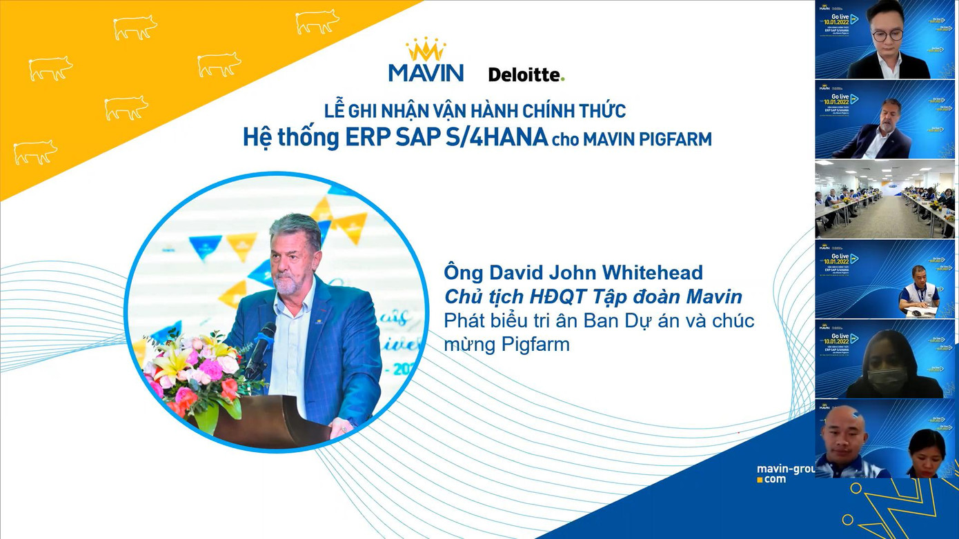 Lễ ghi nhận Go-live được tổ chức trên nền tảng trực tuyến Zoom với các điểm cầu tại văn phòng Hà Nội, Hưng Yên và 27 trang trại sản xuất của Pigfarm trên toàn quốc. Buổi lễ có sự tham dự của Hội đồng quản trị Tập đoàn Mavin, toàn thể Ban lãnh đạo và hơn 100 cán bộ nhân viên của Mavin Pigfarm, đặc biệt có sự tham dự của ban lãnh đạo đối tác Deloitte Consulting Việt Nam.