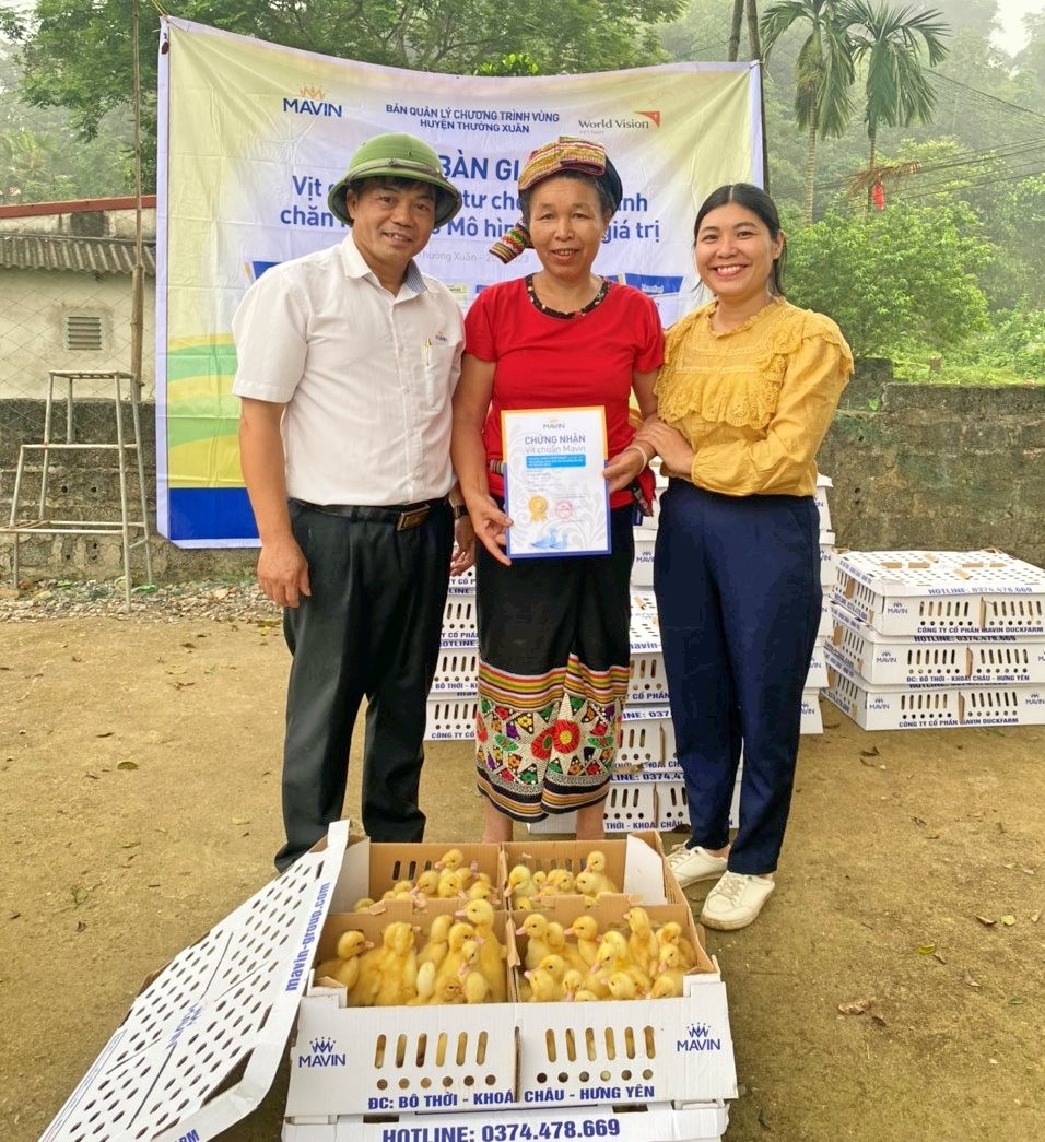 Theo đó, trong chương trình ngày 20/4 vừa qua, Tập đoàn Mavin và World Vision Việt Nam đã trao tặng 12.000 con vịt giống Cherry Valley kèm theo gần 50 tấn thức ăn chăn nuôi hoàn chỉnh, thuốc thú y cho 120 hộ nghèo, dân tộc thiểu số, có hoàn cảnh khó khăn đặc biệt các xã Thọ Thanh, Lương Sơn, Luận Thành, Xuân Cao, Luận Khê và thị trấn Thường Xuân.