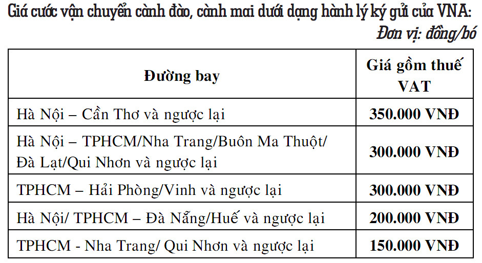 Các hãng hàng không nội địa đua nhau hình thành dịch vụ vận chuyển hoa đào từ Bắc vào Nam và chuyển hoa mai ra Bắc mức cao nhất 350.000 đồng/bó. Các hãng hàng không nội địa đều khuyến cáo do lượng người đông tập trung ở sân bay nên hành khách cần đến sân bay sớm hơn thường lệ (tối thiểu trước 90 phút so với giờ cất cánh).