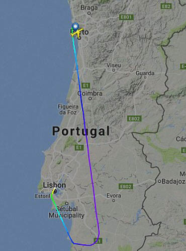 Trên màn hình radar cho thấy, sau khi cất cánh từ Porto, chiếc máy bay di chuyển theo hướng đông nam trước khi quay trở lại và hạ cánh ở Lisbon. Ảnh: Flightradar.