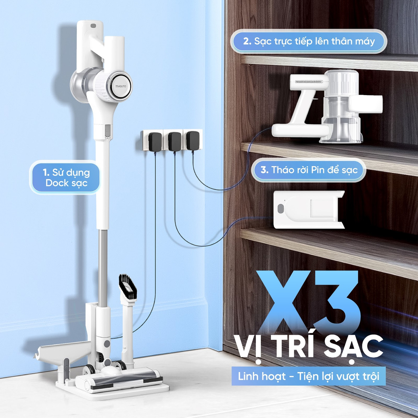Masuto MSClean được thiết kế thông minh với trạm sạc kết hợp giá đỡ, giúp tiết kiệm không gian và đảm bảo việc sạc pin tiện lợi hơn, chỉ cần đặt lại đế sạc và quên đi vấn đề về sạc pin sau mỗi lần sử dụng. Bạn có thể lựa chọn 3 phương thức sạc linh hoạt: