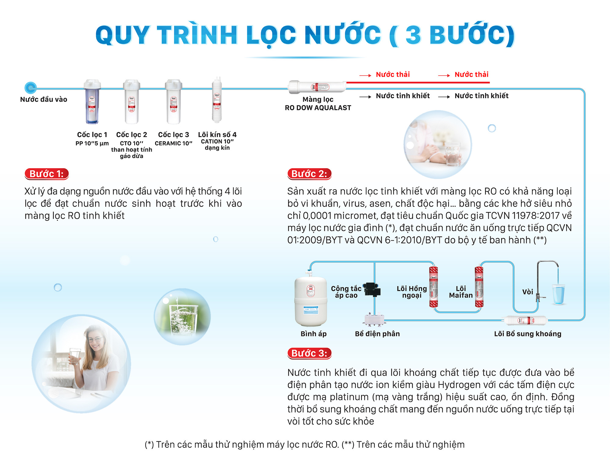 Hãng đã ứng dụng công nghệ lọc thô 4 lõi, màng RO Aqualast nhập khẩu từ Mỹ, hệ thống bù khoáng và đặc biệt bể điện phân với tấm điện cực được mạ Platinum (vàng trắng), điện cực công suất cao lên tới 4.16 A…  Từ đó tạo ra các chỉ số lý tưởng tốt cho sức khỏe, với khả năng chống oxy hoá mạnh, ngăn ngừa bệnh tật.