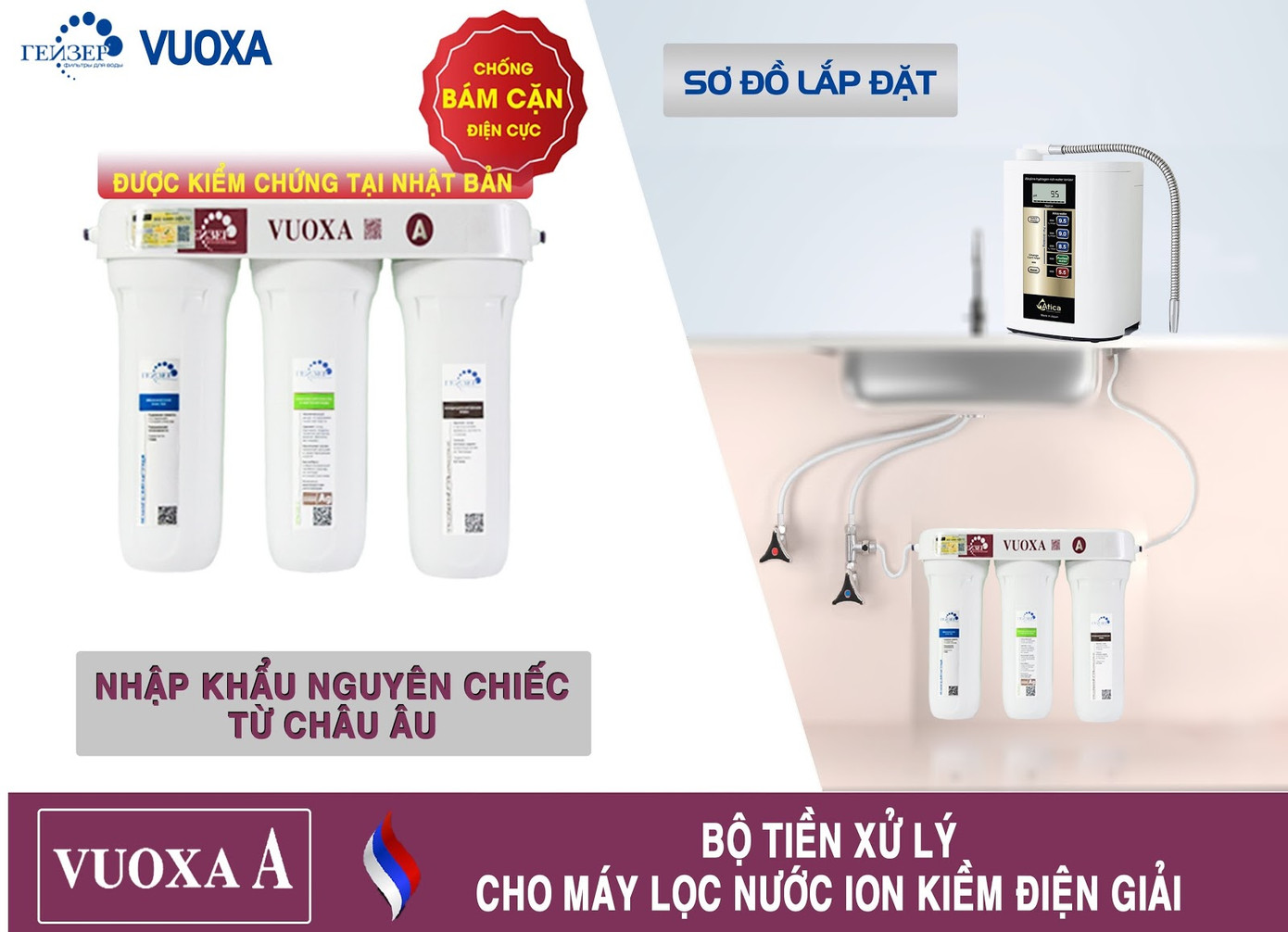 "Bộ tiền xử lý Geyser Vuoxa A là bộ tiền xử lý giúp đảm bảo chất lượng nước ion kiềm và độ bền máy ion kiềm và được chuyên gia Nhật Bản kiểm chứng có khả năng chống bám cặn điện cực vượt trội, giúp tăng độ bền máy ion kiềm điện giải."