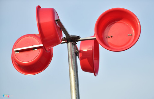 Hệ cánh gió sử dụng những chậu nhựa màu đỏ, lắp đặt rất dễ dàng. Hệ thống điện gió hoạt động theo nguyên tắc rất đơn giản, khi có gió, hệ cánh gió sẽ quay làm trục mô tơ quay, tạo ra điện năng. Lượng điện năng này được lưu trong bình ắc quy và được sử dụng cho đèn chiếu sáng trong nhà. Hệ thống chiếu sáng gồm một bóng đèn Led công suất 9W có độ sáng tương đương bóng đèn sợi đốt 60W thông thường.