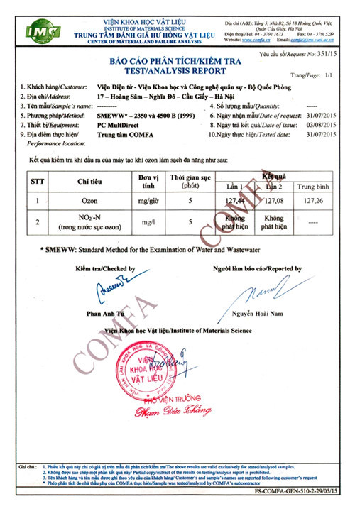 "Hiện máy tạo khí ozone làm sạch đa năng S01 do Viện Điện tử - Viện Khoa học - Công nghệ quân sự nghiên cứu và sản xuất đã được Viện Khoa học vật liệu kiểm nghiệm và có giấy chứng nhận chất lượng, đảm bảo trong quá trình sử dụng không sản sinh ra khí ô xít nitơ, rất an toàn cho người sử dụng", ông Thường khẳng định.
