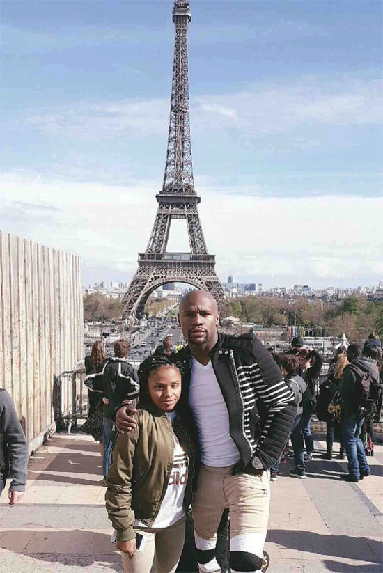 Cựu võ sĩ và con gái chụp ảnh trước tháp Eiffel.