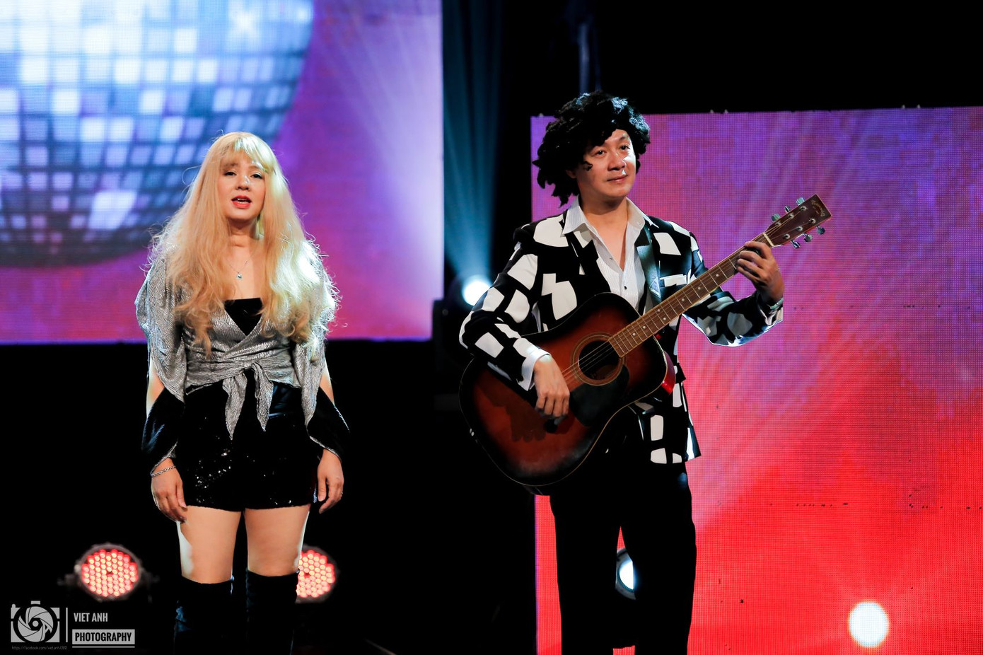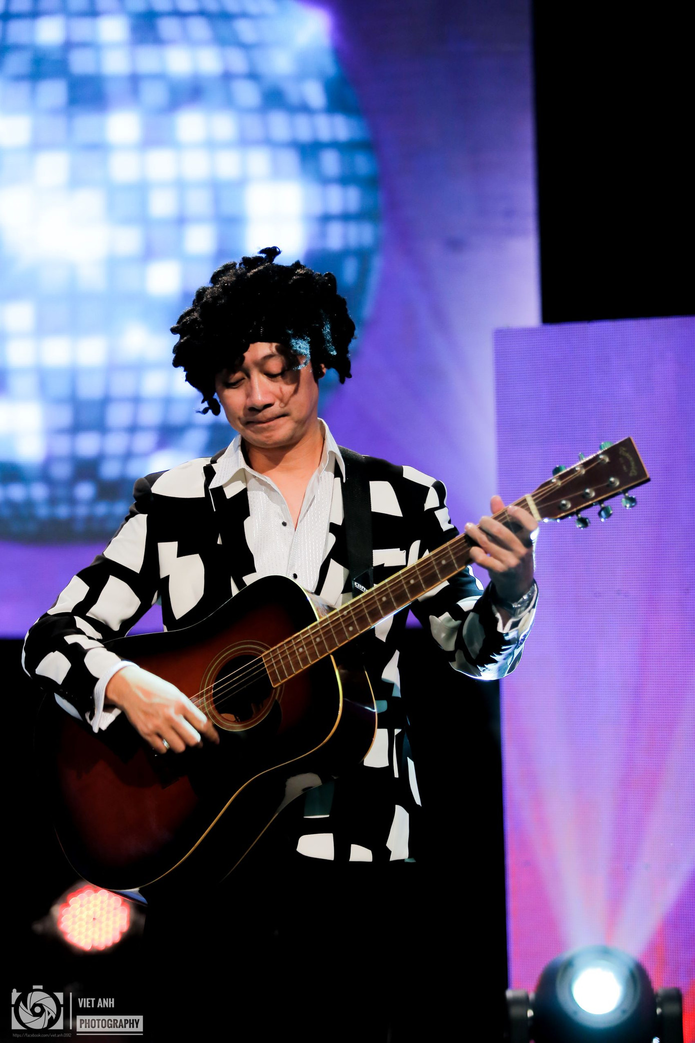 MC Anh Tuấn chơi guitar nhưng lại tạo hình khá hài hước. Nếu anh gắn thêm chiếc mũi đỏ, hẳn sẽ là một chú hề hoàn hảo.