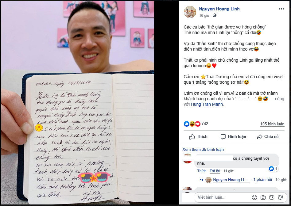 Cùng với bức ảnh, MC Hoàng Linh dí dỏm chú thích "Các cụ bảo: “thế gian được vợ hỏng chồng”, thế nào mà nhà Linh lại “hỏng” cả đôi. Vợ đã “thần kinh” thì chớ, chồng cũng thuộc diện điên nhiệt tình, điên hết mình theo vợ. Thật, không phải nịnh chứ, chồng Linh ga lăng nhất thế gian luôn. Cảm ơn Thái Dương của em vì đã cùng em vượt qua một tháng “sống trong sợ hãi”. Cảm ơn chồng đã vì em, vì 2 bạn cá...”.