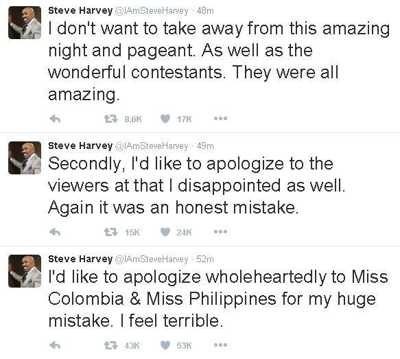 MC của đêm chung kết Miss Universe 2015 – nam diễn viên Steve Harvey viết: “Tôi muốn gửi lời xin lỗi chân thành tới người đẹp Philippines và người đẹp Colombia. Đây là một sai lầm kinh khủng và tội lỗi. Tôi thực sự rất hối hận”. Tuy nhiên, không lâu sau đó, dòng chia sẻ này đã bị Steve xóa đi.