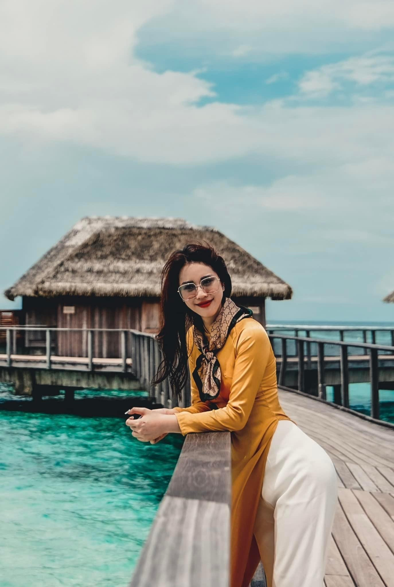 | Mai Phương mặc áo dài chụp ảnh ở Maldives. |