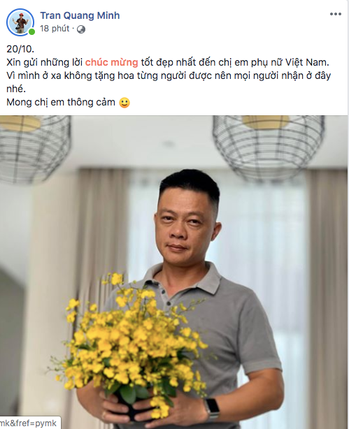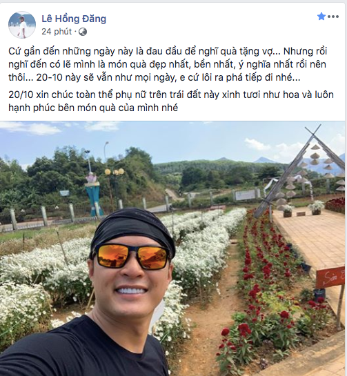 BTV Hữu Bằng hài hước: “Mẹ bảo cắm hoa (thực ra là bỏ hoa vào lọ) cho mẹ mới nhớ hôm nay 20/10. Mong nửa thế giới đừng tách khỏi nửa thế giới còn lại. Vì như vậy trái đất sẽ bị tách làm đôi, ngừng quay và ngày tận thế là chắc chắn. Họ thật quan trọng đấy các anh em ạ”.
