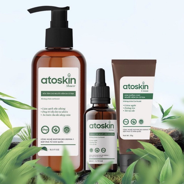 Với các thành phần có nguồn gốc từ thiên nhiên, không chứa corticoid, bộ sản phẩm ATOSKIN (Serum, Kem dưỡng, Sữa tắm) là giải pháp hiệu quả và an toàn cho viêm da cơ địa giúp giảm nhanh ngứa ngáy, viêm da, giúp dưỡng ẩm, làm mềm và dịu da, giảm bong tróc da, thúc đẩy quá trình tái tạo da mới và phục hồi vùng da bị hư tổn.
