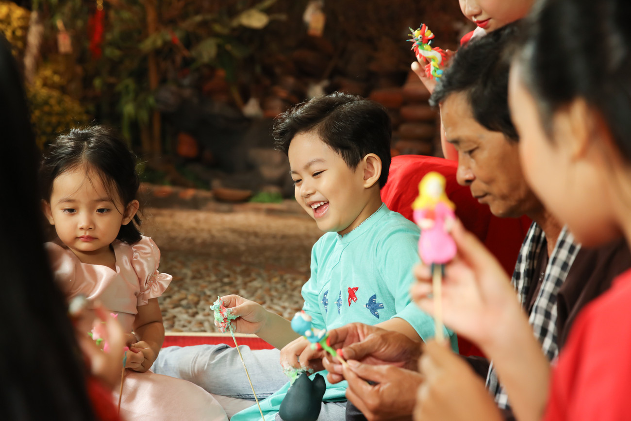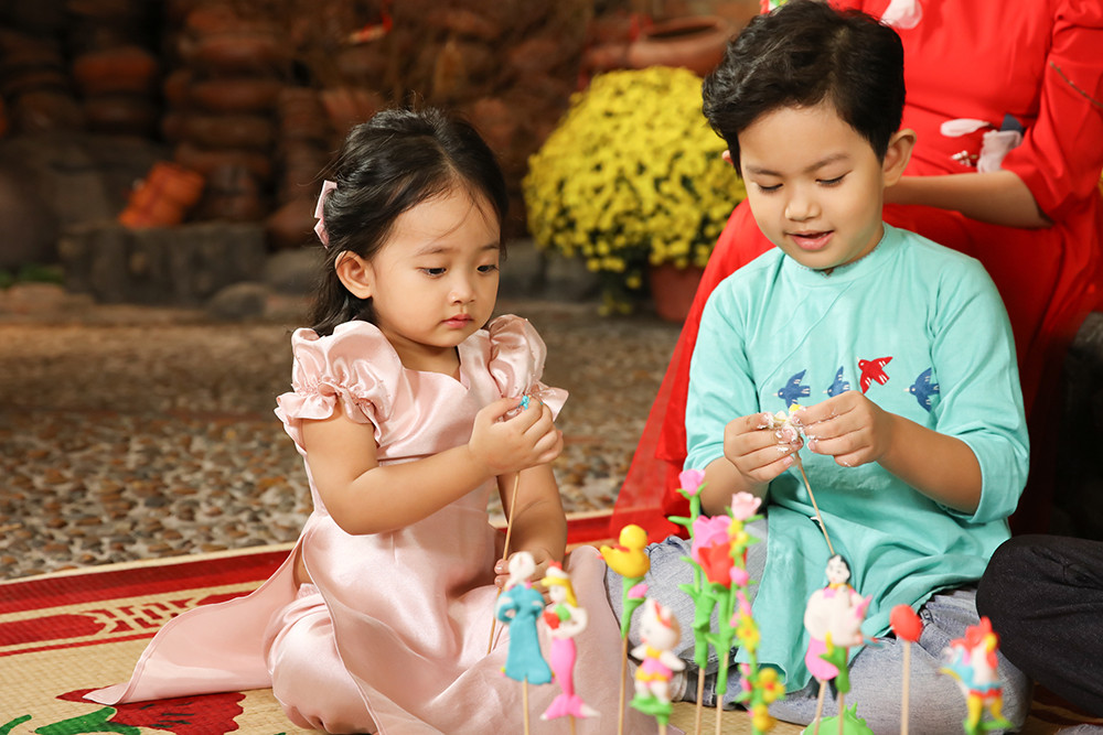 Hai bé Kubi và Anna cũng được bà ngoại dạy gói bánh chưng, vui vẻ chơi tò he.