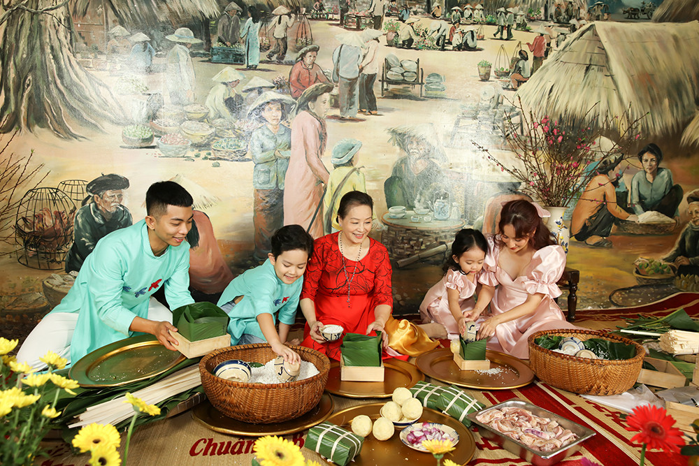 Trong MV, cả gia đình Khánh Thi cùng gói bánh chưng, ăn bữa cơm đoàn viên với những món ăn quen thuộc của ngày Tết.