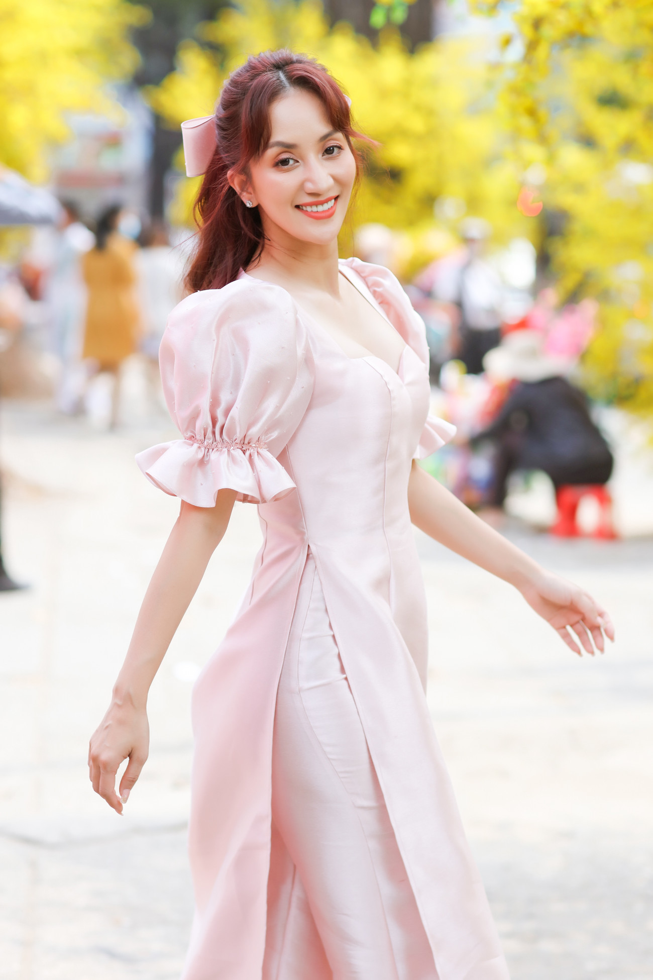 Kiện tướng dancesport diện áo dài hồng pastel khoe vẻ đẹp ngày càng trẻ trung và quyến rũ.